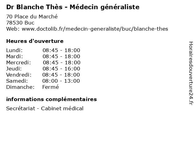1 Dr Blanche Thes - Médecin généraliste (Distance: 0,08 km) 19 Rue de la Bièvre, 78530 Buc blanche, docteur, dr, generaliste, généraliste, medecin, médecin, soins, thes 2 Restaurant La Rose Blanche (Distance: 3,04 km) 3 Rue Jouvencel, 78000 Versailles blanche, couscous, la, marocain, oriental, restaurant, restaurants, rose, tajine 3 Dr Blanche Guillois - Chirurgien-dentiste (Distance: 3,13 km) 10 Rue Georges Clemenceau, 78000 Versailles blanche, chirurgien, dentaire, dentiste, dr, guillois, implantologie, parodontologie 4 Bleue Blanche Rouge (Distance: 3,26 km) 27 Avenue de Saint-Cloud, 78000 Versailles bar, bistro, bistrot, blanche, bleue, brasserie, café, restaurant, restauration, rouge 5 Collège Blanche de Castille (Distance: 6,03 km) 1 avenue de la Bretèche, 78150 Le Chesnay blanche, castille, collège, cours, de, ecole, education, services 6 Dr Blanche d'Anthouard de Vraincourt - Médecin généraliste (Distance: 6,13 km) 177 rue de Versailles, 78150 Le Chesnay anthouard, blanche, consultation, d'anthouard, de, docteur, dr, généraliste, med, médecin, traitement, vraincourt |