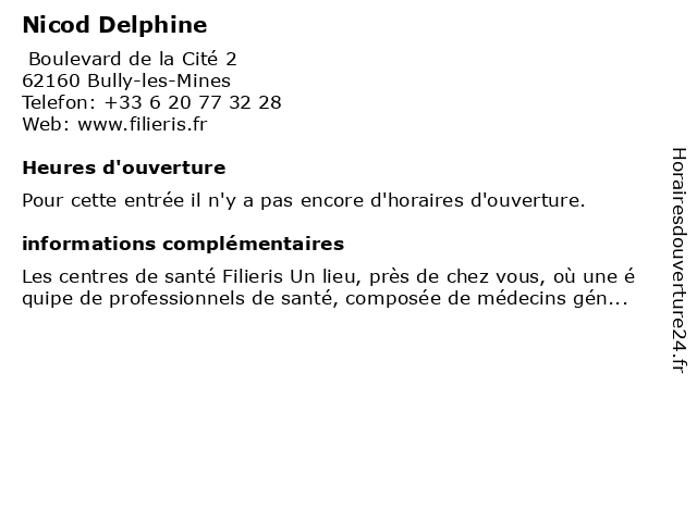 2 Delphine Thomas - Psychologue (Distance: 8,04 km) 47 Rue Saint-Christophe, 62400 Béthune delphine, psy, psychiatre, psychologue, sante, soins, thomas 4 Delphine Stanko - Naturopathe (Distance: 8,94 km) 1B Rue de Mulhouse,, 62620 Maisnil-lès-Ruitz delphine, docteur, naturopathe, sante, soins, stanko 6 Dr Delphine Breviere - Médecin généraliste (Distance: 12,25 km) 209 Rue de Verdun, 62150 Houdain breviere, delphine, docteur, dr, generaliste, généraliste, medical, médecin, soin |