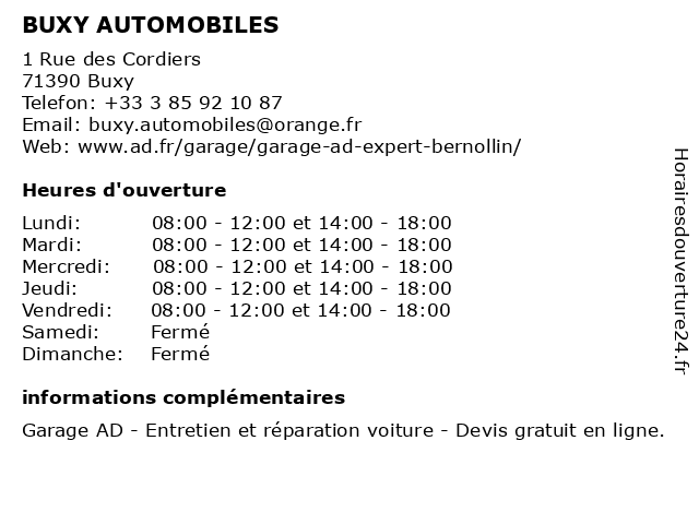 1 Buxy Automobiles - Garage AD Expert (Distance: 0,00 km) 1 Rue des Cordiers, 71390 Buxy ad, automobiles, buxy, carburant, diesel, expert, garage, neuves, occasion, vente, voitures 2 Eurorepar - Garage Marcan Automobiles (Distance: 10,55 km) 3 Rue des Sablières, 71880 Châtenoy-le-Royal aumobile, automobiles, carrosserie, concessionnaire, eurorepar, garage, marcan, réparation, vente 4 Smart Automobiles (Après-Vente) (Distance: 13,47 km) 34 Route 6, 71240 Saint Loup De Varennes après, automobiles, concéssionnaire, garage, motos, smart, vente 5 Smart Automobiles (Distance: 13,47 km) 34 Route 6, 71240 Saint Loup De Varennes automobiles, concéssionnaire, garage, motos, smart 6 Chalon Automobiles - Groupe Guillet (Distance: 13,86 km) 1 Avenue de l'Automobile, 71100 Chalon sur Saône automobile, automobiles, chalon, concessionnaire, entretien, groupe, guillet, neuve, occasion, réparation, vente |
