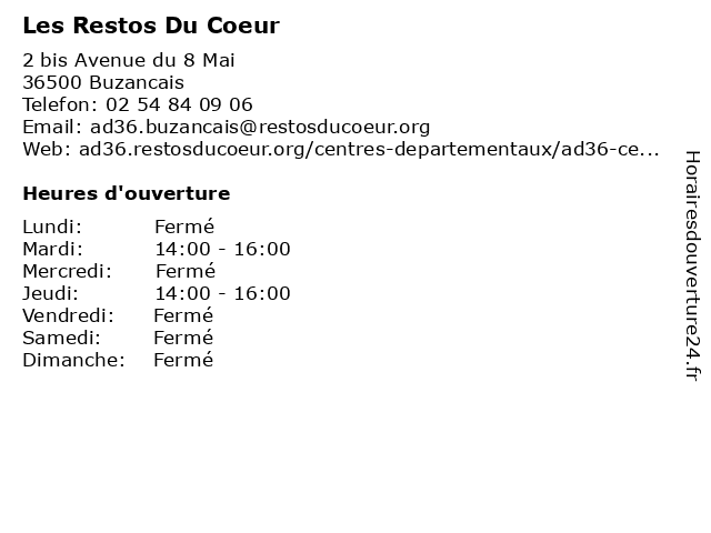 1 Les Restos Du Coeur (Distance: 17,04 km) 4 Rue Hoche, 36110 Levroux aides, alimentaire, coeur, du, les, restos, santé, solidarité, soutien 2 Pharmacie Coeur de Brenne (Distance: 18,35 km) 7 Rue André Plateau, 36290 Mezières-en-Brenne aromathérapie, brenne, coeur, de, homéopathie, médicament, pharmacie, pharmacien giphar 3 Librairie Coeur de Brenne (Distance: 18,42 km) 4 Rue du Pont Malientras, 36290 Mézières-en-Brenne brenne, cadeau, coeur, de, librairie, livre, magazine, presse 4 DECHETTERIE COEUR DE BRENNE (Distance: 19,13 km) La Chaume à Raté, 36290 Saint-Michel-en-Brenne brenne, coeur, de, dechetterie 5 Les Restos Du Coeur Châteauroux Vaugirard (Distance: 20,49 km) 138 Rue de Vaugirard, 36000 Châteauroux aide, aide alimentaire, châteauroux, coeur, dons, du, les, restos, solidarité, vaugirard, vente 6 Les Restos Du Coeur (Distance: 21,09 km) 13 Rue de Provence, 36000 Chateauroux aide, aide alimentaire, coeur, dons, du, les, restos, solidarité, vente |
