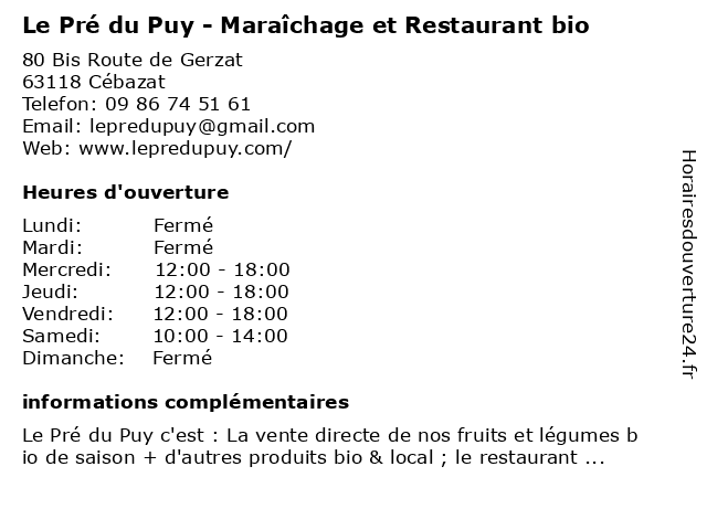 Termes de recherche pour Le Pré du Puy - Maraîchage et Restaurant bio:restaurant, du, et, le, cebazat, puy, bio, pré, maraîcher, maraîchage, le pré du puy |