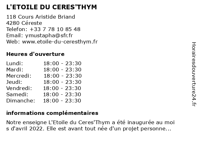 | Dimanche | 18:00-23:30 |