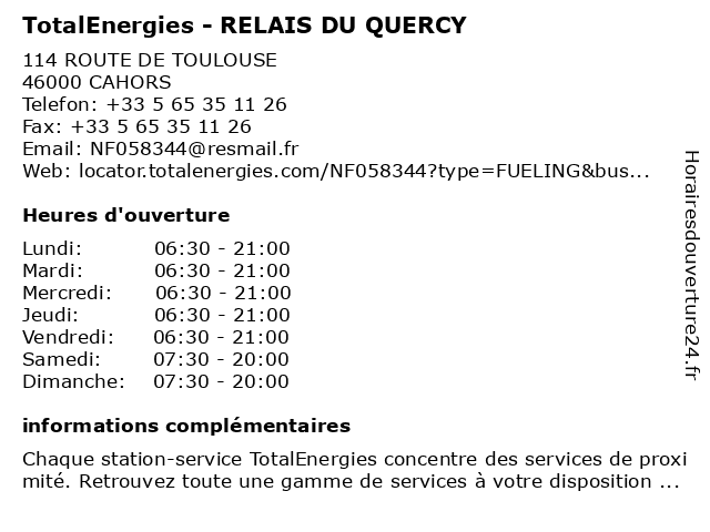 Termes de recherche pour TotalEnergies - RELAIS DU QUERCY:relais, du, total, quercy, gas station, station service, tankstelle, totalenergies |