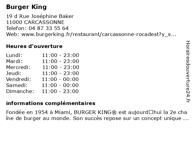 1 Burger King (Distance: 3,76 km) Lieu Dit La Treille, 11000 Carcassonne bar & gril, burger, king, restaurant américain, restaurant de hamburgers, restaurant familial, restaurant à emporter 2 Burger King (Distance: 6,74 km) 330 Boulevard Henry Bouffet, 11000 CARCASSONNE bar & gril, burger, king, restaurant américain, restaurant de hamburgers, restaurant familial, restaurant à emporter 3 King Jouet (Distance: 0,18 km) - Rue Josephine Baker, 11000 Carcassonne jeux, jouet, jouets, king, magasin, peluches 4 Top Burger (Distance: 3,41 km) 34 Rue De La Liberte, 11000 Carcassonne burger, jean, maillot, paul, restaurants, top 5 Burger King - Drive (Distance: 3,58 km) - ZI du Pont Rouge, 11000 Carcassonne burger, burgers, drive, fast, food, hamburgers, king, rapide, restaurant, restauration 6 Burger King - Drive (Distance: 3,76 km) - Cap'Cinéma Pont Rouge, 11000 Carcassonne américain, burger, drive, fast, food, king, restaurant, sandwichs |