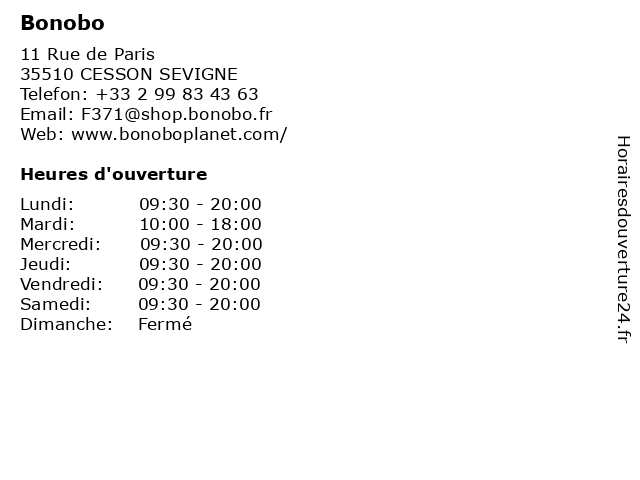 1 Bonobo (Distance: 0,01 km) . La Rigourdière, 35510 Cesson Sevigne beaute, bonobo, cafe, chaussures, enfants, mode femmes, mode hommes, restaurant, sport 3 Bonobo (Distance: 4,52 km) . C.C. La Poterie, 35200 Rennes accessoires, bonobo, mode, patisserie, textile 5 Bonobo (Distance: 7,70 km) . Rue de L’Étang, 35760 Saint Gregoire bonobo, cafe, chaussures, enfants, homme, lingerie, mode femme, restaurant, service 6 Bonobo (Distance: 8,02 km) s/n Route Saint-Malo, 35760 Saint-Grégoire accessoires, bonobo, boutiques, commercial, mode, services, vêtements |
