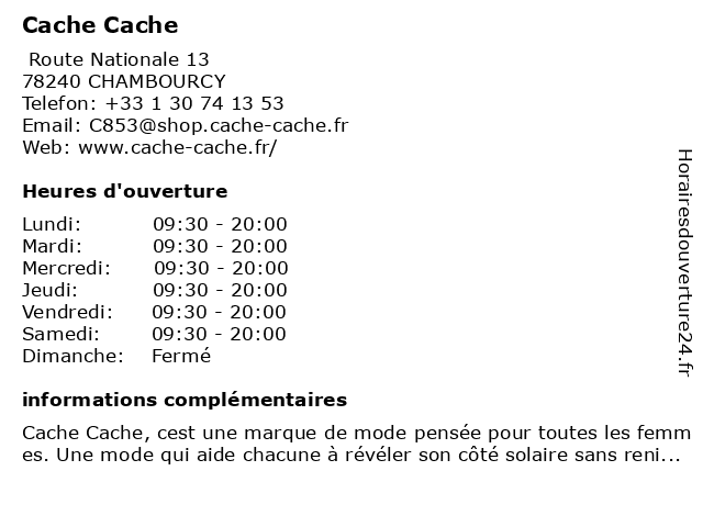 1 Cache Cache (Distance: 0,74 km) . Chambourcy, 78240 Chambourcy beaute, cache, cafe, chaussures, enfants, hommes, lingerie, mode femmes, restaurant, sport 4 Cache Cache (Distance: 10,17 km) 30 Rue Maurice Berteaux, 78700 CONFLANS SAINTE HONORINE blazer femme, boutique vêtements, cache, cardignan femme, chaussures femme, gilet femme, jean femme, magasin vêtements, manteau femme, mode femme, pull femme, robe femme, sac femme, t-shirt femme, tailleur femme, top femme, vêtements femme 6 Cache Cache (Distance: 16,12 km) 67 Rue Saint-Denis, 92700 Colombes blazer femme, boutique vêtements, cache, cardignan femme, chaussures femme, gilet femme, jean femme, magasin vêtements, manteau femme, mode femme, pull femme, robe femme, sac femme, t-shirt femme, tailleur femme, top femme, vêtements femme |