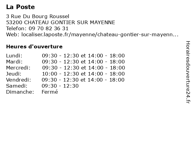 1 La Poste (Distance: 0,01 km) 3 Rue du Bourg Roussel, 53200 Château-Gontier colis, express chronopost, expédition, la, poste, réexpédition internationale, service, suivi du courrier 2 La Poste (Distance: 1,58 km) 7 Rue du Val de Loire, 53200 Azé agence, assurance, banque, banque postale, bureau de poste, chronopost, colis, courrier, dps, expéditions internationales, la, point, postale, poste, relais, timbres, téléphonie, ups, western union 3 La Poste (Distance: 5,98 km) 1 Rue de Chateau Gontier, 53200 Coudray colis, express chronopost, expédition, la, poste, réexpédition internationale, service, suivi du courrier 4 La Poste (Distance: 7,61 km) 08 Rue de la Division Leclerc, 53200 Gennes sur Glaize colis, express chronopost, expédition, la, poste, réexpédition internationale, service, suivi du courrier 6 La Poste (Distance: 13,71 km) 4 bis Rue des 2 Haies, 49500 Segré-en-Anjou Bleu colis, express chronopost, expédition, la, poste, réexpédition internationale, service, suivi du courrier |