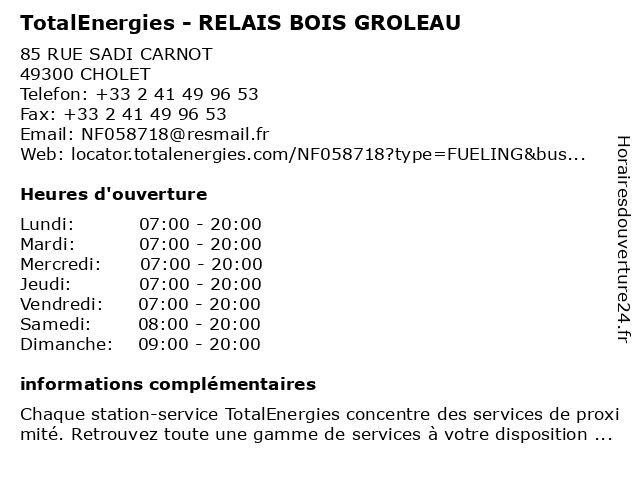 Termes de recherche pour TotalEnergies - RELAIS BOIS GROLEAU:relais, bois, total, gas station, station service, groleau, tankstelle, totalenergies |