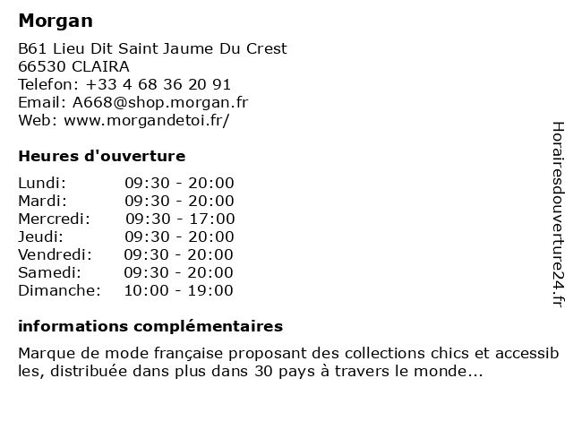 1 Morgan (Distance: 3,06 km) . De Barcares, 66531 Claire cafe, chaussures, enfants, homme, mode femme, morgan, restaurant, sport 2 Morgan (Distance: 3,53 km) . Route de Saint Jaume, 66530 Claira beaute, cafe, chaussures, enfants, hommes, lingerie, mode femmes, morgan, restaurant, sport 3 Morgan (Distance: 0,59 km) . Route 83, 66530 Claira cafe, chaussures, enfants, homme, lingerie, mode femme, morgan, restaurant, sport 4 Morgan (Distance: 8,16 km) 9 rue des Marchands, 66000 Perpignan accessoires, femme, magasin, mode, morgan, vêtements 5 Promod (Distance: 3,24 km) . Lieu-dit Saint-Jaume du Crest, 66530 Claira accessoires, boutique, jupes, mode, promod, pull, robes 6 Vib's (Cache Cache - Bonobo) (Distance: 3,30 km) B61 Lieu Dit Saint Jaume Du Crest, 66530 CLAIRA blazer femme, bonobo, boutique vêtement, cache, cardignan femme, chaussures femme, gilet femme, jean femme, jean homme, magasin vêtement, magasin vêtements mixte, manteau femme, manteau homme, mode femme, pull femme, pull homme, robe femme, sac femme, t-shirt femme, t-shirt homme, tailleur femme, top femme, vib's, vêtement femme, vêtement homme, vêtement mixte |