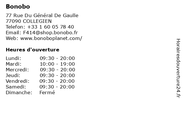 5 Bonobo (Distance: 13,37 km) . Avenue du Général-de-Gaulle, 93117 Rosny-Sous-Bois beaute, bonobo, cafe, chaussures, enfants, mode femmes, mode hommes, restaurant, sport 6 Bonobo (Distance: 18,93 km) 30 Boulevard Paul Vaillant-Couturier, 94200 Ivry Sur Seine bonobo, enfant, femme, homme, jeans, mode |