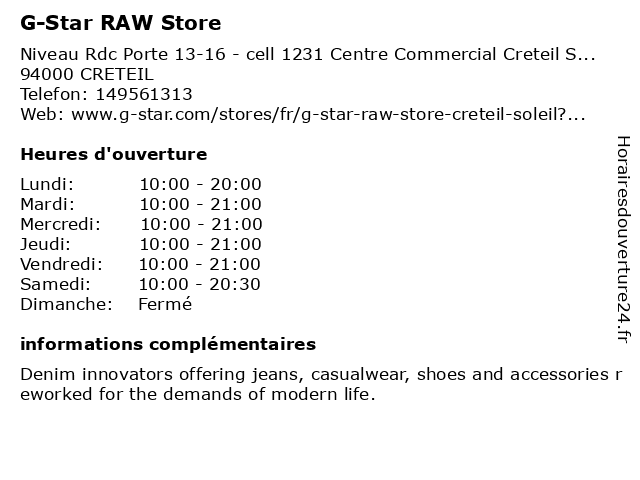1 G-Star RAW Store (Distance: 10,21 km) 24 rue du Faubourg Saint Antoine, 75012 PARIS boutique de cadeaux, magasin d?accessoires de mode, magasin de chaussures, magasin de vêtements pour femmes, magasin de vêtements pour hommes, raw, star, store 2 G-Star RAW Store (Distance: 17,10 km) Ccial So Ouest - 2A - MS12 31 Rue d'Alsace, 92300 LEVALLOIS PERRET boutique de cadeaux, magasin d?accessoires de mode, magasin de chaussures, magasin de vêtements pour femmes, magasin de vêtements pour hommes, raw, star, store 3 G-Star RAW Store (Distance: 19,55 km) CC Regional 3 Allee du Preambule, 77566 LIEUSAINT boutique de cadeaux, magasin d?accessoires de mode, magasin de chaussures, magasin de vêtements pour femmes, magasin de vêtements pour hommes, raw, star, store 4 G-Star RAW Store (Distance: 19,88 km) 1er Etage Centre Commercial Parinor, 93600 AULNAY SOUS BOIS boutique de cadeaux, magasin d?accessoires de mode, magasin de chaussures, magasin de vêtements pour femmes, magasin de vêtements pour hommes, raw, star, store 5 G Star (Distance: 0,01 km) 101 Avenue du Général de Gaulle, 94012 Creteil accessoires, mode, porter, pret, star, vetement 6 Nike Store Creteil - Closed (Distance: 0,04 km) 101 Avenue De La France Libre, 94012 CRETEIL closed, creteil, magasin de chaussures, magasin de vêtements pour enfants, magasin de vêtements pour femmes, magasin de vêtements pour hommes, mode, nike, store |