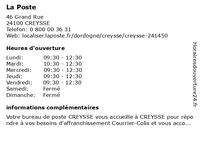 1 La Poste (Distance: 3,30 km) - Route du Coustinet, 24520 Cours-de-Pile agence, assurance, banque, banque postale, bureau de poste, chronopost, colis, courrier, dps, expéditions internationales, la, point, postale, poste, relais, timbres, téléphonie, ups, western union 2 La Poste (Distance: 4,67 km) 1 chemin Mouthe, 24100 Lembras agence, assurance, banque, banque postale, bureau de poste, chronopost, colis, courrier, dps, expéditions internationales, la, point, postale, poste, relais, timbres, téléphonie, ups, western union 3 La Poste (Distance: 5,89 km) - Place du Foyer Rural, 24520 Saint-Nexans agence, assurance, banque, banque postale, bureau de poste, chronopost, colis, courrier, dps, expéditions internationales, la, point, postale, poste, relais, timbres, téléphonie, ups, western union 4 La Poste (Distance: 7,59 km) - Le Bourg, 24520 Liorac-sur-Louyre agence, assurance, banque, banque postale, bureau de poste, chronopost, colis, courrier, dps, expéditions internationales, la, point, postale, poste, relais, timbres, téléphonie, ups, western union 5 La Poste (Distance: 8,84 km) n/a Le Bourg, 24140 Campsegret agence, assurance, banque, banque postale, bureau de poste, chronopost, colis, courrier, dps, expéditions internationales, la, point, postale, poste, relais, timbres, téléphonie, ups, western union 6 La Poste (Distance: 9,92 km) - Lieu dit le Bourg, 46200 Saint-Sozy agence, assurance, banque, banque postale, bureau de poste, chronopost, colis, courrier, dps, expéditions internationales, la, point, postale, poste, relais, timbres, téléphonie, ups, western union |