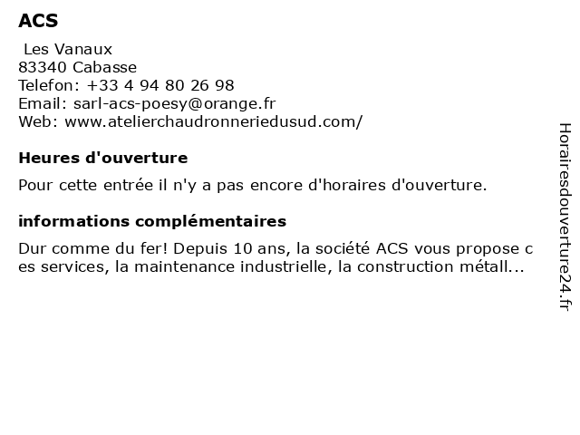 1 ACS (Distance: 40,30 km) 476 Rue Albert Einstein Zi La Palud, 83600 Frejus acs, atelier d'usinage, atelier de réparation automobile, centre de contrôle technique, magasin de carrosserie auto, magasin de pièces automobiles, station-service de changement de l'huile 2 ACS Gestion Immobilière (Distance: 50,34 km) 41 avenue des Alliés, 13360 Roquevaire acs, agence, gestion, immobilier, immobilière, location, transaction, vente 3 ACS Azur Médica Santé (Distance: 50,59 km) 29 Rue Messieurs Boyer, 13720 La Bouilladisse acs, azur, médica, santé |