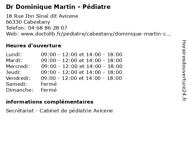 1 Dr Laura Fournols - Pédiatre (Distance: 0,00 km) 18 Rue Ibn Sinaï dit Avicene, 66330 Cabestany docteur, dr, fournols, generaliste, laura, medical, pédiatre, soin 2 Dr Germaine Bachelard - Pédiatre (Distance: 0,00 km) 18 Rue Ibn Sinaï dit Avicene, 66330 Cabestany bachelard, docteur, dr, generaliste, germaine, medical, pédiatre, soin 3 Dr Valentina Dumitrana Racaru - Pédiatre (Distance: 0,00 km) 18 Rue Ibn Sinaï dit Avicene, 66330 Cabestany docteur, dr, dumitrana, generaliste, medical, pédiatre, racaru, soin, valentina 4 Dr Florence Kaspi - Pédiatre (Distance: 0,00 km) 18 Rue Ibn Sinaï dit Avicene, 66330 Cabestany docteur, dr, florence, generaliste, kaspi, medical, pédiatre, soin 5 Dr Laura Marty - Pédiatre (Distance: 0,00 km) 18 Rue Ibn Sinaï dit Avicene, 66330 Cabestany dr, enfant, laura, marty, pediatre, pédiatre, sante, soins 6 Dr Dominique Saly-Plana - Médecin généraliste (Distance: 0,11 km) 1 Rue Ibn Sinaï dit Avicenne, 66330 Cabestany consultation, docteur, dominique, dr, généraliste, med, médecin, plana, saly, traitement |