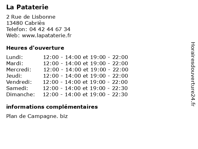 1 La Pataterie (Distance: 1,10 km) - Le Collet Rouge Bas, 13170 Les Pennes Mirabeau boissons, la, nourriture, pataterie, restaurant 2 La Pataterie (Distance: 26,22 km) n/a Avenue des Joncs, 13920 SAINT MITRE LES REMPARTS beverages, children menus, dessert, la, pataterie, restaurant, salads, the potato burgers 3 La Pataterie (Distance: 57,15 km) 690 boulevard Saint Joseph, 04100 MANOSQUE beverages, children menus, dessert, la, pataterie, restaurant, salads, the potato burgers 4 La Pizza de Nico (Distance: 0,00 km) 2 Rue de Lisbonne, 13480 Cabriès boissons, de, la, nico, nourriture, pizza, restaurant 5 La Cantine d'Edouard (Distance: 0,00 km) 2 Rue de Lisbonne, 13480 Cabriès boissons, cantine, d'edouard, la, nourriture, restaurant 6 La Brioche (Distance: 0,00 km) 2 Rue de Lisbonne, 13480 Cabriès boissons, brioche, la, nourriture, restaurant |