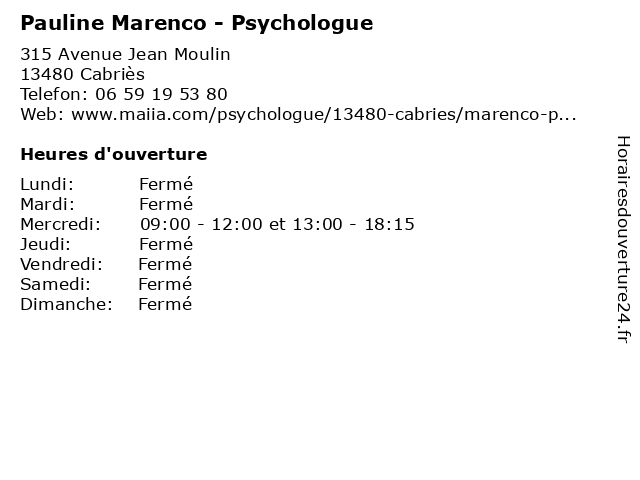 1 Pauline Marenco - Psychologue (Distance: 7,73 km) 606 Avenue du Général de Gaulle, 13109 Simiane-Collongue marenco, pauline, psy, psychiatre, psychologue, sante, soins 2 Pauline Normand - Psychologue (Distance: 6,87 km) 17 Square Abbé Blaise, 13080 Luynes folie, normand, pauline, psychiatre, psychiatrie, psychiatrique, psychologue 3 Pauline Riviere - Sage-femme (Distance: 11,26 km) 279 Rue Rabelais, 13016 Marseille du, femme, maternité, pauline, périnée, riviere, rééducation, sage, uro-gynécologique 4 Pauline Medina - Diététicien - secrétariat (Distance: 11,27 km) 28 Boulevard du Roi René, 13100 Aix-en-Provence cabinet, diététicien, diététique, medical, medina, pauline, secrétariat 5 Dr Pauline Merenda - Radiologue (Distance: 11,54 km) - Avenue des Tamaris, 13616 Aix-en-Provence diagnostique, dr, imagerie, merenda, médicale, pauline, radiologie, radiologue, thérapeutique 6 Pauline Landre - Masseur-kinésithérapeute (Distance: 14,79 km) 21 Rue Marc Donadille, 13013 Marseille bien-être, en, forme, kinésithérapeute, kinésithérapie, landre, masseur, pauline, remise, rééducation |