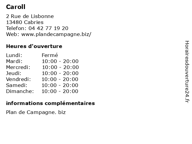 1 Caroll (Distance: 3,26 km) . Avenue Plan De Campagne, 13480 Cabries cafe, caroll, chaussures, enfants, lingerie, mode femme, mode homme, restaurant 2 Caroll (Distance: 3,52 km) 113 Route Nationale, 13127 Vitrolles accessories, cafe, caroll, costume, homme, mode, pantalons, pulls, restaurant, service 3 Caroll (Distance: 6,45 km) 11 Avenue de Saint Antoine, 13464 Marseille beaute, caroll, chaussures, deco, enfants, mode femmes, mode hommes, restaurant, sport 5 Caroll (Distance: 8,12 km) Route Nationale 113, 13127 Vitrolles blazer femme, cardignan femme, caroll, chaussures femme, gilet femme, jean femme, magasin femme, magasin vêtements, manteau femme, mode femme, pull femme, robe femme, sac femme, t-shirt femme, tailleur femme, top femme, vêtements femmes 6 |