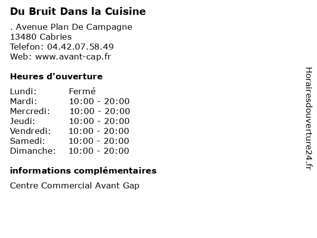 1 Du Bruit dans la Cuisine (Distance: 3,49 km) s/n Chemin de la Grande Campagne, 13480 Cabriès accessoires, bruit, cuisine, dans, du, décoration, epicerie, la, ustensils 2 Du Bruit dans la Cuisine (Distance: 11,63 km) - Quai du Lazaret, 13478 Marseille bruit, cuisine, dans, du, la, ustensils 3 Cuisine Plus Marseille Plan de Campagne (Distance: 2,44 km) 1 Chemin des Pennes au Pin, 13170 Les Pennes-Mirabeau campagne, cuisine, de, marseille, plan, plus 4 SARL CUISINE PLUS PROVENCE (Distance: 2,75 km) 1 Chemin Des Pennes Aux Pins, 13170 Les Pennes Mirabeau cuisine, plus, provence, sarl 5 La Cuisine De Bruno (Distance: 2,89 km) Za De l Agavon Quar Le Repos, 13170 Les Pennes Mirabeau bruno, cuisine, restaurants 6 Darty cuisine Plan de Campagne (Distance: 3,22 km) Avenue du Plan de Campagne, 13480 Les Pennes-Mirabeau campagne, cuisine, darty, de, plan |