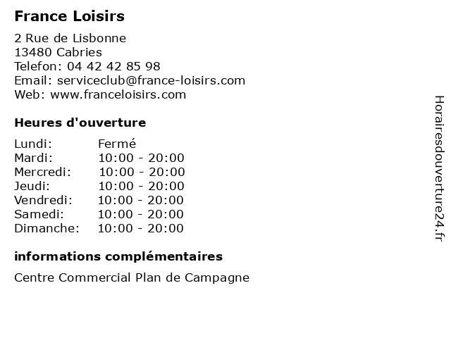 1 France Loisirs (Distance: 3,26 km) . Avenue Plan De Campagne, 13480 Cabries cafe, chaussures, enfants, france, lingerie, loisirs, mode femme, mode homme, restaurant 2 France loisirs (Distance: 13,55 km) Niveau 1 Centre Bourse, Centre Commercial Bourse, 13001 Marseille books, business, france, loisirs, stores 3 France Loisirs (Distance: 13,79 km) 27 Rue Papassaudi, 13100 Aix En Provence beaute, france, idees shopping, loisirs 4 France Loisirs (Distance: 13,84 km) 17 Cours Belsunce, 13231 Marseille alimentation, beauté & santé, culture & loisirs, enfants, france, high-tech, loisirs, maison & déco, mode, restaurants 5 France Loisirs (Distance: 17,33 km) . Route de la Sablière, 13011 Marseille centre, commercial, france, loisirs, marseille, valentine 6 Loisirs 2000 (Distance: 2,21 km) 18 Bis Chemin de la Bédoule, 13240 Septèmes-les-Vallons 2000, loisirs |