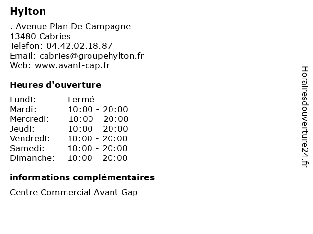 1 Hylton (Distance: 3,22 km) - Centre Commercial Avant Cap, 13480 Cabries boutique, chaussures, femmes, hylton, magasins, prêt à porter 2 Hylton (Distance: 12,20 km) 1175 rue Guillaume du Vair, 13290 Aix-en-Provence accessoires, hylton, mode, mode pour hommes, vêtements pour hommes 3 Hylton (Distance: 13,19 km) 17 Cours Belsunce, 13231 Marseille baskets, bottes, bottines, chaussures, hylton, marseille 4 Hylton (Distance: 16,51 km) 41 Rue Espariat, 13100 Aix-en-Provence accessoires, chaussures, hylton, maroquinerie, mode 5 Hylton (Distance: 18,20 km) n/c Route de la Sablière, 13011 Marseille baskets, bottes, bottines, chaussures, hylton 6 Athenaïs (Distance: 0,00 km) . Plan de Campagne, 13170 Les Pennes Mirabeau athenaïs, beaute, cafe, chaussures, enfants, hommes, lingerie, mode femmes, restaurant, sport |