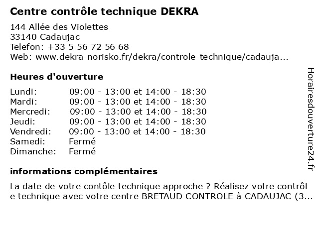 Description de l'entreprise :Préparer votre contrôle techniquePour préparer votre contrôle technique dans notre centre DEKRA de Cadaujac, vous pouvez vérifier en amont différents points comme les pneumatiques, la visibilité, le niveau d'huile ou encore l'habitacle. Pour tout savoir, consultez notre vidéo. Voir l'offre |