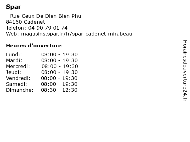 1 Spar (Distance: 5,43 km) - Rue du Maréchal Juin, 13640 La Roque-d'Anthéron alimentaire, alimentation, courses, distributeur, spar, supermarché, supérette, épicerie 2 SPAR (Distance: 7,40 km) - Boulevard du Nord, 84160 Cucuron alimentation, légumes et de fruits, spar, épicerie 3 Spar (Distance: 7,45 km) 4 Cours St Etienne, 13840 Rognes alimentation, légumes et de fruits, spar, épicerie 4 Spar (Distance: 11,37 km) 992 Avenue Jean Moulin, 84120 Pertuis alimentation, légumes et de fruits, spar, épicerie 5 Spar (Distance: 11,63 km) - Place Garcin, 84120 Pertuis alimentation, légumes et de fruits, spar, épicerie 6 |