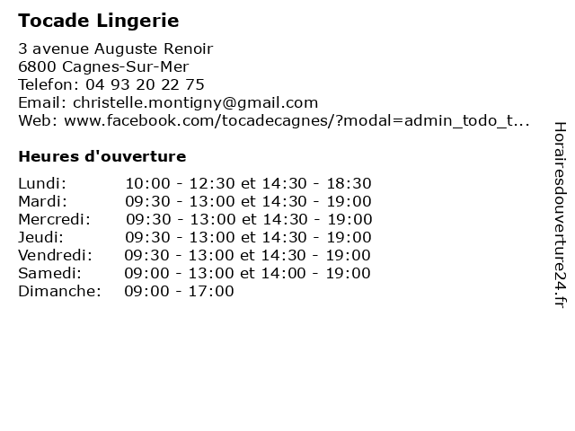 2 Etam Lingerie & Prêt-à-porter (Distance: 3,89 km) - Les Cavaliers, 06270 Villeneuve Loubet accessories, bra, clothing, etam, homewear, knickers, legwear, lingerie, porter, prêt, swimwear 3 Sylvie Lingerie (Distance: 7,66 km) 78 Avenue de Nice, 06600 Antibes boutique, femme, habillement, lingerie, mode, sylvie 4 Lingerie Ophélie (Distance: 9,86 km) 12-14 Boulevard Albert 1er, 06600 Antibes boutique, femme, lingerie, nuisette, nuit, ophelie, ophélie 5 Orcanta Lingerie (Distance: 10,14 km) 30 Avenue Jean Medecin, 06000 Nice bijoux, boutique de chaussures, femme, lingerie, luxe homme, mode, orcanta 6 Livy Lingerie (Distance: 10,17 km) 6 Avenue Jean Médecin, 06000 Nice bas, boxer, corset, culotte, lingerie, livy, nuisette, tanga |