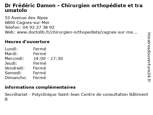 1 Medecin Christian Lacour (Chirurgien orthopédiste et traumatologue) (Distance: 0,01 km) 53 Avenue des Alpes, 06800 Cagnes-sur-Mer chirurgien, christian, docteur, et, lacour, medecin, orthopédiste, sante, services, traumatologue 2 Dr Jonathan Thomas - Chirurgien orthopédiste et traumatologue (Distance: 0,01 km) 53 Avenue des Alpes, 06800 Cagnes-sur-Mer chirurgien, docteur, dr, et, jonathan, orthopédiste, sante, soins, thomas, traumatologue 3 Dr Fanny Elia - Chirurgien orthopédiste et traumatologue (Distance: 0,01 km) 53 Avenue des Alpes, 06800 Cagnes-sur-Mer chirurgien, docteur, dr, elia, et, fanny, orthopédiste, sante, soins, traumatologue 4 Medecin Herve Dal Zotto (Chirurgien orthopédiste et traumatologue) (Distance: 10,91 km) 40 Boulevard Victor Hugo, 06000 Nice chirurgien, dal, docteur, et, herve, medecin, orthopédiste, sante, services, traumatologue, zotto 5 Dr Mathieu Nicolas - Chirurgien orthopédiste - secrétariat (Distance: 13,65 km) 33 Boulevard d'Oxford, 06400 Cannes chirurgien, consultation, docteur, dr, mathieu, med, médecin, médecine, nicolas, orthopédiste, secrétariat, traitement 6 Medecin Nicolas Bronsard (Chirurgien orthopédiste et traumatologue) (Distance: 13,69 km) 30 Avenue de la Voie Romaine, 06000 Nice bronsard, chirurgien, docteur, et, medecin, nicolas, orthopédiste, sante, services, traumatologue |