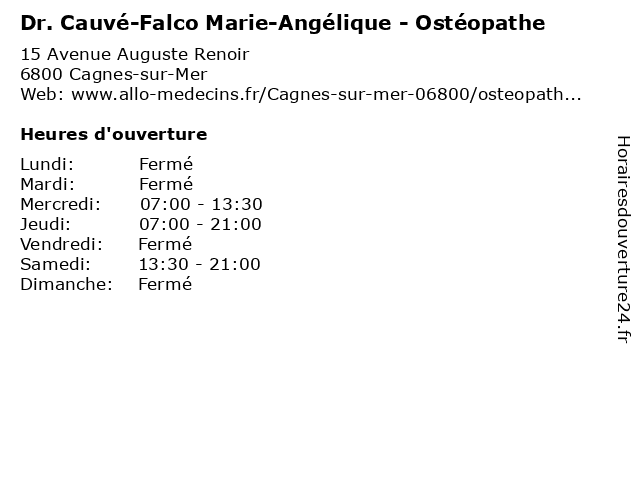 1 Angélique Fernandez Martin - Hypnothérapeute (Distance: 3,38 km) 243 Avenue du Général Leclerc, 06700 Saint-Laurent-du-Var angélique, fernandez, hypnose, hypnotherapeute, hypnothérapeute, martin, sante, soins 2 Cauvé-falco Marie-angélique (Distance: 3,63 km) 2140 Chemin du Malvan, 06570 Saint-Paul-de-Vence angélique, cauvé, falco, marie 3 Maître Angélique Touati - Avocate (Distance: 10,60 km) 1 Place du Palais, 06300 Nice angélique, avocate, avocats, civils, droits, juridiques, maître, touati 4 Falco Toiture Rénovation (Distance: 15,06 km) 214 Chemin des Romains, 06250 Mougins falco, rénovation, toiture 5 Angélique Toilettage (Distance: 15,99 km) 3 Rue Molière, 06400 Cannes angélique, animaux, beauté, chat, chien, shampouinage, toilettage 6 Angélique Vallée - Ostéopathe (Distance: 17,19 km) 121 Boulevard Emmanuel Rouquier, 06130 Grasse angelique, angélique, ostéo, ostéopathe, ostéopathes, soins, vallee, vallée |