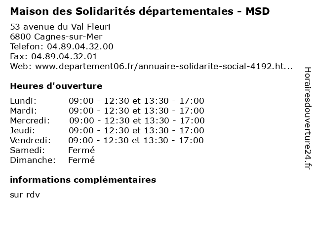 1 Maison des Solidarités départementales - MSD (Distance: 1,83 km) 341 avenue Général Leclerc, 06700 Saint-Laurent-du-Var aide, assistance, des, départementales, enfance, information, maison, msd, public, service, sociale, solidarités 2 Maison des Solidarités départementales - MSD (Distance: 3,23 km) 27 boulevard Paul Montel, 06000 Nice aide, assistance, des, départementales, enfance, information, maison, msd, public, service, sociale, solidarités 3 Maison des Solidarités départementales - MSD (Distance: 6,82 km) 173-175 rue de France, 06000 Nice aide, assistance, des, départementales, enfance, information, maison, msd, public, service, sociale, solidarités 4 Maison des Solidarités départementales - MSD (Distance: 9,08 km) 144 boulevard de Cessole, 06100 Nice aide, assistance, des, départementales, enfance, information, maison, msd, public, service, sociale, solidarités 5 Maison des Solidarités départementales - MSD (Distance: 9,24 km) 37 avenue Maréchal Foch, 06000 Nice aide, assistance, des, départementales, enfance, information, maison, msd, public, service, sociale, solidarités 6 Maison des Solidarités départementales - MSD (Distance: 9,95 km) 3 avenue du Grand Cavalier, 06600 Antibes aide, assistance, des, départementales, enfance, information, maison, msd, public, service, sociale, solidarités |