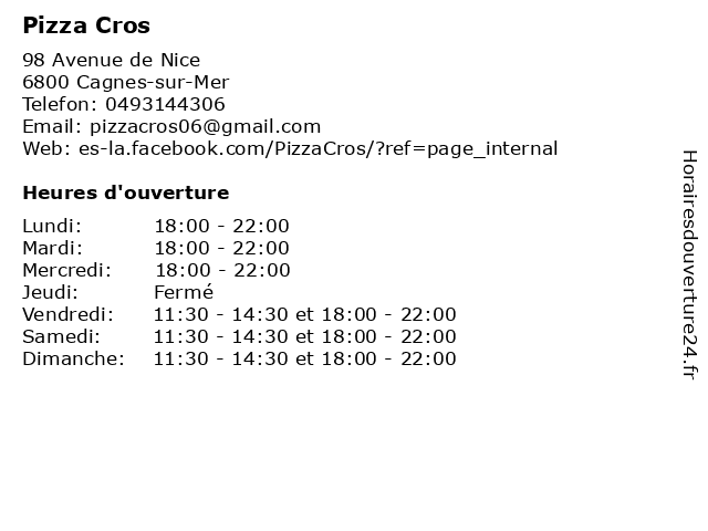 | Dimanche | 11:30-14:30 et 18:00-22:00 |