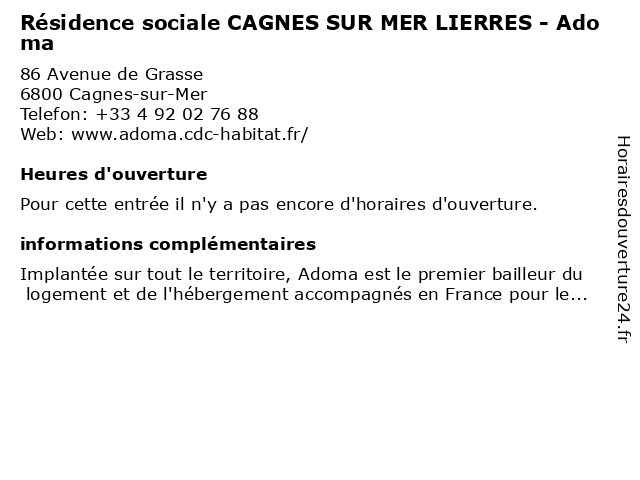 | Appeler Résidence sociale CAGNES SUR MER LIERRES - Adoma | |