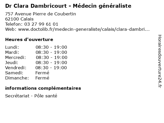 1 Dr Pierre-Antoine Dambricourt - Médecin généraliste (Distance: 0,00 km) 757 Avenue Pierre de Coubertin, 62100 Calais antoine, dambricourt, docteur, dr, generaliste, généraliste, medical, médecin, pierre, soin 2 AXA Assurance et Banque Bertrand Dambricourt (Distance: 36,79 km) 21 Place du Maréchal Foch, 62500 Saint-Omer assurance, assurance appartement, assurance auto, assurance entreprise, assurance epargne, assurance habitation, assurance maison, assurance professionnelle, assurance santé, assurance voiture, axa, banque, bertrand, dambricourt, et 3 Clara Lemierre - Ostéopathe (Distance: 36,90 km) 1499 Avenue de Petite-Synthe, 59640 Dunkerque clara, lemierre, osteo, osteopathe, ostéopathe, sante, soins 4 Alix Dambricourt - Pédicure-podologue (Distance: 40,22 km) 110 Rue de Blendecques, 62570 Helfaut alix, cheville, dambricourt, orteil, pied, podologue, pédicure 5 Dr. Clara Deflandre - Chirurgien général (Distance: 40,25 km) 130 avenue Louis Herbeaux, 59385 Dunkerque chirurgien, clara, consultation, deflandre, docteur, dr., général, med, médecin, médecine, traitement 6 Clara Fontaine - Ostéopathe (Distance: 52,94 km) 1 Avenue François Mitterrand, 62310 Fruges clara, fontaine, ostéo, ostéopathe, ostéopathes, soins |