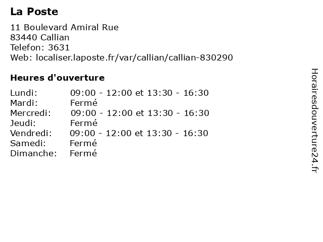 1 La Poste (Distance: 2,14 km) 136 Chemin de Camiole, 83440 Montauroux agence postale, courrier postal, expédition internationale, la, poste 3 La Poste (Distance: 7,83 km) - Route de Draguignan, 06530 Le Tignet agence postale, courrier postal, expédition internationale, la, poste 4 La Poste (Distance: 7,85 km) 161 Place du Champ de Foire, 83440 Saint-Paul-en-Forêt agence, assurance, banque, banque postale, bureau de poste, chronopost, colis, courrier, dps, expéditions internationales, la, point, postale, poste, relais, timbres, téléphonie, ups, western union 6 La Poste (Distance: 8,25 km) - Route de Bagnols, 83600 Fréjus agence postale, courrier postal, expédition internationale, la, poste |