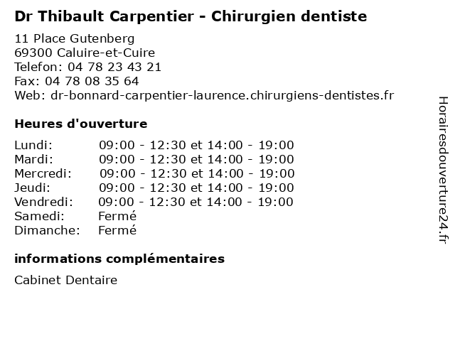 1 Dr Etienne Carpentier - Chirurgien dentiste (Distance: 0,00 km) 11 Place Gutenberg, 69300 Caluire-et-Cuire carpentier, chirurgien, dentaire, dentiste, dr, etienne, implantologie, parodontologie 2 Dr Laurence Bonnard-Carpentier - Chirurgien-dentiste (Distance: 0,00 km) 11 Place Gutenberg, 69300 Caluire-et-Cuire bonnard, carpentier, chirurgien, dentaire, dentiste, dr, implantologie, laurence, parodontologie 3 Dr Bénédicte Piot Carpentier - Chirurgien-dentiste (Distance: 0,00 km) 11 Place Gutenberg, 69300 Caluire-et-Cuire bénédicte, carpentier, chirurgien, chirurgien-dentiste, dentiste, dr, médecins, médicaments, piot, santé, secrétariat, spécialiste 5 Dr Thibault Bador - Dentiste (Distance: 3,58 km) 1 place St Nizier, 69001 Lyon bador, clinic, dentiste, dr, médecin, thibault 6 Chez Thibault (Distance: 4,85 km) 80 rue Montesquieu, 69007 Lyon bistrot, chez, nourriture, restaurant, thibault |