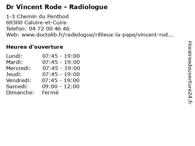 1 Dr Vincent Rode - Radiologue (Distance: 0,06 km) 1-3 Chemin du Penthod, 69300 Caluire et Cuire consultation, docteur, dr, med, médecin, radiologue, rode, traitement, vincent 2 Dr Vincent Rode - Radiologue (Distance: 1,97 km) 25 Rue de Flesselles, 69001 Lyon consultation, docteur, dr, med, médecin, radiologue, rode, traitement, vincent 3 Dr Vincent Rode - Radiologue (Distance: 5,45 km) 44 Rue Gambetta, 69270 Fontaines-sur-Saône consultation, docteur, dr, med, médecin, radiologue, rode, traitement, vincent 4 Dr Vincent Rode - Radiologue (Distance: 5,62 km) 44 Rue Gambetta, 69270 Fontaines-sur-Saône consultation, docteur, dr, med, médecin, médecine, radiologue, rode, secrétariat, traitement, vincent 5 Dr Vincent Jahandiez - Anesthésiste (Distance: 0,03 km) 1 Chemin du Penthod, 69300 Caluire-et-Cuire anes, anesthésiste, dr, jahandiez, réa, réanimateur, vincent 6 Dr. Agnès Rode - Radiologue (Distance: 0,64 km) 103 Grande rue de la Croix Rousse, 69004 Lyon agnes, agnès, consultation, docteur, dr., med, médecin, médecine, radiologue, rode, traitement |
