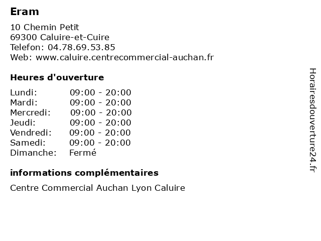 1 Eram (Distance: 3,76 km) 8 Grande Rue La Croix Rousse, 69004 Lyon acessoires, eram, femme, homme, la marque, les boutiques, sacs, texto 2 Eram (Distance: 3,89 km) n/a chemin, 69300 Caluire Et Cuire accessories, bags, eram, kids, men, shoes, women 3 Eram (Distance: 4,47 km) 32 Avenue Henri Barbusse, 69100 Villeurbanne accessoires, chaussures, enfants, eram, femmes, hommes, sacs 4 Eram (Distance: 4,98 km) 31 Rue Grenette, 69002 Lyon accessoires, chaussures, enfants, eram, femmes, hommes, sacs 6 Eram (Distance: 5,10 km) 125 Rue du Docteur Bouchut, 69003 Lyon accessoires, chaussures, enfant, eram, femme, homme, magasin |