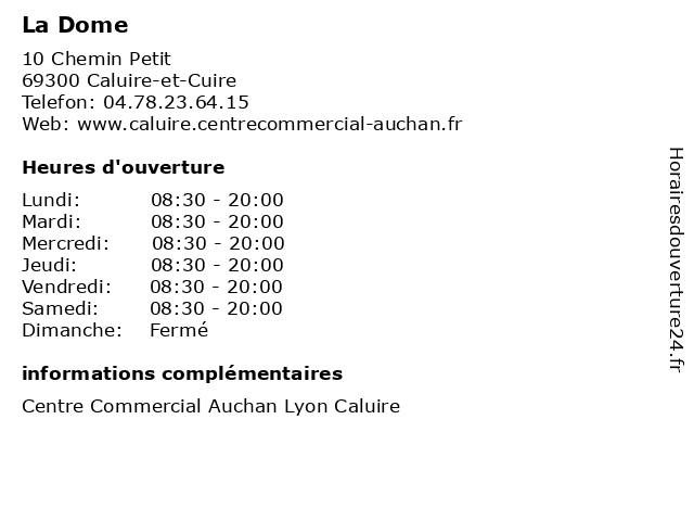 1 Le Dome (Distance: 7,21 km) 10 Chemin Jean Petit, 69300 Lyon beaute, bouygues, cafe, chausures, club, dome, enfants, le, mode femmes, mode hommes, restaurant, sport, telecom 2 Dome Construction Siège social (Distance: 7,25 km) 35 Rue Smith, 69002 Lyon construction, dome, siège, social 3 Auchan Services/SAV (Distance: 0,00 km) 10 Chemin Petit, 69300 Caluire-et-Cuire auchan, cafe, deco, enfants, homme, mode femme, restaurant, services/sav 4 Darty (Distance: 0,00 km) 10 Chemin Petit, 69300 Caluire-et-Cuire cafe, darty, deco, enfants, homme, mode femme, restaurant 5 DDP (Distance: 0,00 km) 10 Chemin Petit, 69300 Caluire-et-Cuire cafe, ddp, deco, enfants, homme, mode femme, restaurant 6 Douglas (Distance: 0,00 km) 10 Chemin Petit, 69300 Caluire-et-Cuire cafe, deco, douglas, enfants, homme, mode femme, restaurant |