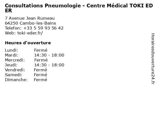 1 Maison Sport Santé TOKI EDER (Distance: 0,00 km) 7 Avenue Jean Rumeau, 64250 Cambo-les-Bains eder, maison, santé, sport, toki 2 Hôpital de proximité : Médecine-SMR Polyvalents - Centre Médical TOKI EDER (Distance: 0,00 km) 7 Avenue Jean Rumeau, 64250 Cambo-les-Bains centre, de, eder, hôpital, médecine, médical, polyvalents, proximité, smr, toki 3 Soins Médicaux de Réadaptation spécialisés Pneumologiques - Centre Médical TOKI EDER (Distance: 0,00 km) 7 Avenue Jean Rumeau, 64250 Cambo-les-Bains centre, de, eder, médical, médicaux, pneumologiques, réadaptation, soins, spécialisés, toki 4 Centre Médical Toki Eder (Distance: 0,01 km) 7 Avenue Jean Rumeau, 64250 Cambo-les-Bains centre, eder, médical, toki 5 Soins Médicaux de Réadaptation spécialisés Cardiologiques-Centre Médical TOKI EDER (Distance: 0,16 km) 7 Avenue Jean Rumeau, 64250 Cambo-les-Bains cardiologiques, centre, de, eder, médical, médicaux, réadaptation, soins, spécialisés, toki 6 Centre de Réeducation Cardio-Respiratoire - Pneumologie (secrétariat ) (Distance: 0,38 km) - avenue de Navarre, 64250 Cambo Les Bains cardio, centre, consultation, de, docteur, pneumologie, respiratoire, réeducation, santé, secrétariat |
