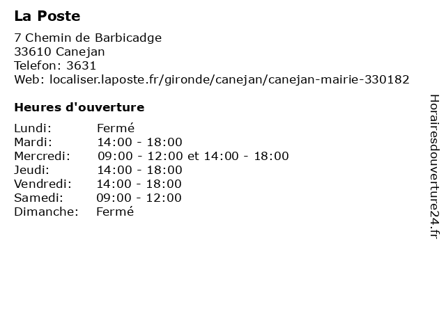 1 La Poste (Distance: 3,11 km) - Place Choisy Latour, 33610 Cestas agence, colis, courriers, expédition, la, postale, poste, relais 3 La Poste (Distance: 3,36 km) 1 Route de Leognan, 33170 Gradignan agence, colis, courriers, expédition, la, postale, poste, relais 6 |