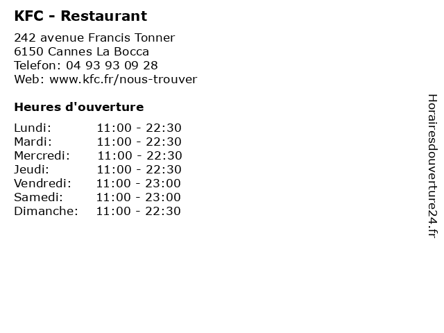 1 KFC - Drive (Distance: 0,00 km) 242 avenue Francis Tonner, 06150 Cannes La Bocca drive, kfc, rapide, restauration 2 KFC Cannes La Bocca (Distance: 0,01 km) 242-244 Avenue Francis Tonner, 06150 Cannes bocca, burgers et buckets, cannes, fastfood, frites, kfc, la, poulet et bucket, restaurant 6 |