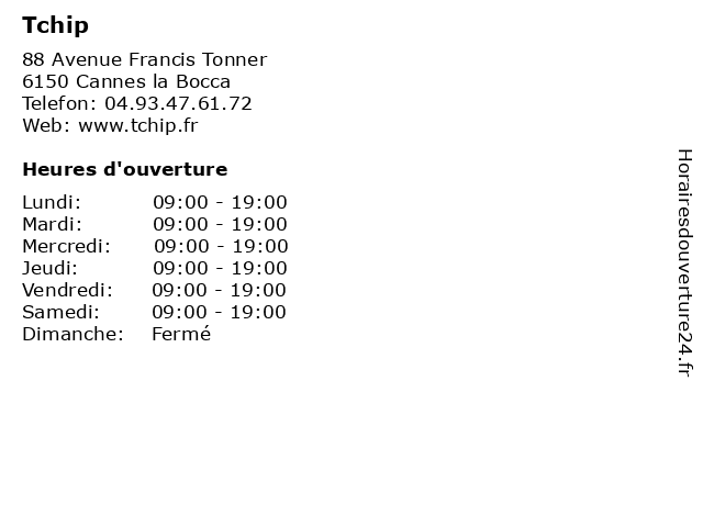 2 Tchip Coiffure (Distance: 3,13 km) 69 Avenue Franklin Roosevelt, 06100 Le Cannet beaute, coiffure, salon, tchip 3 Tchip Coiffure (Distance: 3,24 km) 300 Avenue de Cannes, 06210 Mandelieu la Napoule beauté, coiffeur, coiffure, institut, produits, salon, services, tchip 5 Tchip Coiffure (Distance: 7,03 km) . Avenue des Martyrs de la Résistance, 06220 Vallauris beaute, coiffure, salon, tchip 6 |
