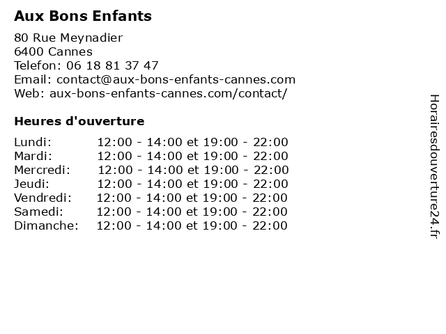 | Dimanche | 12:00-14:00 et 19:00-22:00 |