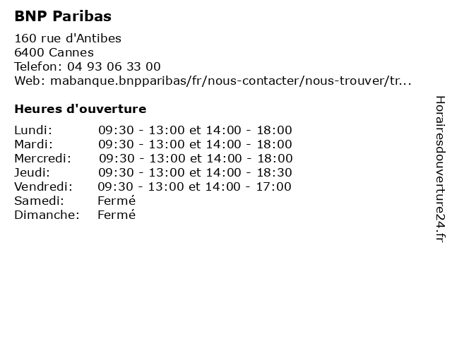 1 BNP Paribas (Distance: 0,01 km) 160 Rue d'Antibes, 06400 Cannes accounts, bank, bnp, credits, insurance, investing, paribas, saving, services 3 BNP Paribas (Distance: 7,52 km) 437 Avenue de Cannes, 06210 Mandelieu-la-Napoule accounts, bank, bnp, credits, insurance, investing, paribas, saving, services 4 BNP Paribas (Distance: 7,52 km) 437 Avenue de cannes, 06210 Mandelieu la napoule bnp, bnp paribas, mandelieu la napoule, paribas 5 BNP Paribas (Distance: 7,57 km) 1 Route de grasse, 06602 Antibes juan les pins antibes juan les pins, bnp, bnp paribas, paribas 6 BNP Paribas (Distance: 7,90 km) 695 route des Dolines, 06560 Valbonne antipolis, banque, bnp, consommation, paribas, sophia |