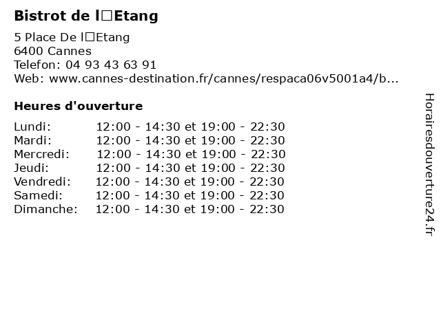 | Dimanche | 12:00-14:30 et 19:00-22:30 |