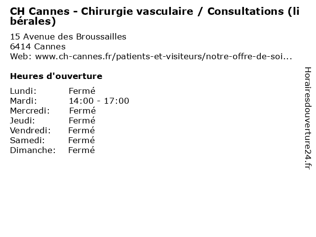 1 CH Cannes - Chirurgie ambulatoire / Consultations (Distance: 0,00 km) 15 Avenue des Broussailles, 06414 Cannes ambulatoire, bureau, cannes, ch, chirurgie, consultation, consultations, dr, maladie, med, médecin, médecine, pratique, thérapie, traitement 2 CH Cannes - Chirurgie ambulatoire / secrétariat (Distance: 0,00 km) 15 Avenue des Broussailles, 06414 Cannes ambulatoire, bureau, cannes, ch, chirurgie, consultation, dr, maladie, med, médecin, médecine, pratique, secrétariat, thérapie, traitement 3 CH Cannes - Gynécologie / secrétariat (Distance: 0,00 km) 15 Avenue des Broussailles, 06414 Cannes bureau, cannes, ch, consultation, dr, gynécologie, maladie, med, médecin, médecine, pratique, secrétariat, thérapie, traitement 4 CH Cannes - Chirurgie digestive / secrétariat (Distance: 0,00 km) 15 Avenue des Broussailles, 06414 Cannes bureau, cannes, ch, chirurgie, consultation, digestive, dr, maladie, med, médecin, médecine, pratique, secrétariat, thérapie, traitement 5 CH Cannes - Chirurgie digestive / visites (Distance: 0,00 km) 15 Avenue des Broussailles, 06414 Cannes bureau, cannes, ch, chirurgie, consultation, digestive, dr, maladie, med, médecin, médecine, pratique, thérapie, traitement, visites 6 CH Cannes (Distance: 1,80 km) 7 Rue Teisseire, 06400 Cannes bureau, cannes, ch, consultation, dr, maladie, med, médecin, médecine, pratique, thérapie, traitement |