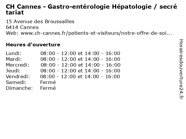 1 CH Cannes - Chirurgie ambulatoire / Consultations (Distance: 0,00 km) 15 Avenue des Broussailles, 06414 Cannes ambulatoire, bureau, cannes, ch, chirurgie, consultation, consultations, dr, maladie, med, médecin, médecine, pratique, thérapie, traitement 2 CH Cannes - Chirurgie ambulatoire / secrétariat (Distance: 0,00 km) 15 Avenue des Broussailles, 06414 Cannes ambulatoire, bureau, cannes, ch, chirurgie, consultation, dr, maladie, med, médecin, médecine, pratique, secrétariat, thérapie, traitement 3 CH Cannes - Gynécologie / secrétariat (Distance: 0,00 km) 15 Avenue des Broussailles, 06414 Cannes bureau, cannes, ch, consultation, dr, gynécologie, maladie, med, médecin, médecine, pratique, secrétariat, thérapie, traitement 4 CH Cannes - Chirurgie digestive / secrétariat (Distance: 0,00 km) 15 Avenue des Broussailles, 06414 Cannes bureau, cannes, ch, chirurgie, consultation, digestive, dr, maladie, med, médecin, médecine, pratique, secrétariat, thérapie, traitement 5 CH Cannes - Chirurgie digestive / visites (Distance: 0,00 km) 15 Avenue des Broussailles, 06414 Cannes bureau, cannes, ch, chirurgie, consultation, digestive, dr, maladie, med, médecin, médecine, pratique, thérapie, traitement, visites 6 CH Cannes (Distance: 1,80 km) 7 Rue Teisseire, 06400 Cannes bureau, cannes, ch, consultation, dr, maladie, med, médecin, médecine, pratique, thérapie, traitement |