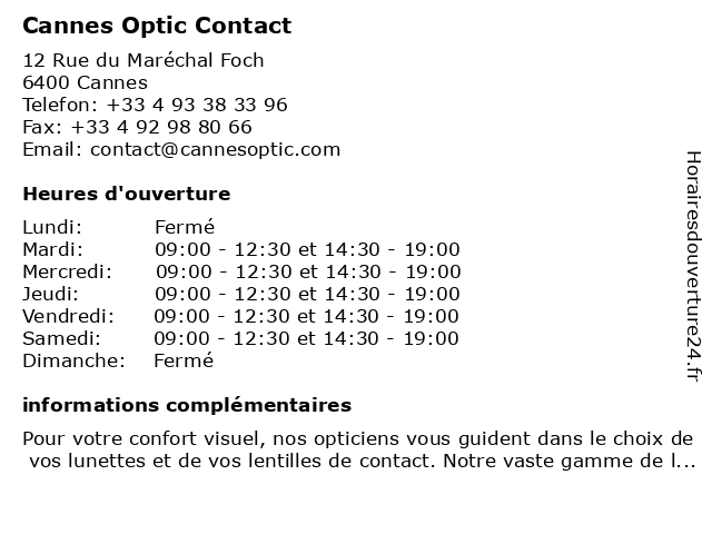 2 Opticien Cannes - Optic 2000 (Distance: 0,32 km) 12 Rue Chabaud, 06400 Cannes 2000, cannes, lentilles de contact, lunettes de soleil, lunettes de vue, optic, optic2000, opticien, opticien optic2000, ray-ban, rayban 3 Green Acres - Sun Contact Immobilier (Distance: 0,50 km) 44 Boulevard De La République, 06400 Cannes acres, agency, agent, apartment, contact, green, home, immobilier, real estate, sun 5 Carrefour Contact (Distance: 4,02 km) 1 Boulevard de l'Esterel, 06150 Cannes alimentaire, alimentation, carrefour, contact, courses, distributeur, hypermarché, supermarché, épicerie 6 Optic Tournamy de Belval (Distance: 6,19 km) 762 Avenue de Tournamy, 06250 Mougins belval, de, lentilles, lunettes, montures optiques, optic, opticien, opticiens, tournamy, verres |