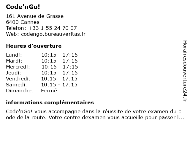 2 ObjectifCode - Centre d'examen du code de la route Cannes (Distance: 1,01 km) 95 Boulevard Carnot, 06400 Cannes cannes, centre, code, d'examen, de, du, la, objectifcode, route 3 ObjectifCode - Centre d'examen du code de la route Cannes (Distance: 1,02 km) 95 Boulevard Carnot, 06400 Cannes cannes, centre, code, code de la route, code de la route cannes, code neph, code pas cher, d'examen, de, du, examen code de la route, la, objectifcode, passer le code de la route, route, résultats code de la route, test code de la route 4 ObjectifCode - Centre d'examen du code de la route Cannes (Distance: 1,09 km) 5 Rue De Mimont, 06400 Cannes cannes, centre, code, d'examen, de, du, la, objectifcode, route 5 La Poste - Centre d’examen du code de la route (Distance: 1,16 km) 7 Rue De Liège, 06400 Cannes centre, centre d'évaluation scolaire, code, de, du, d’examen, la, poste, route, école technique 6 ObjectifCode - Centre d'examen du code de la route Cannes La Bocca (Distance: 2,38 km) 44 Avenue Michel Joudan, 06150 Cannes-La-Bocca bocca, cannes, centre, code, d'examen, de, du, la, objectifcode, route |