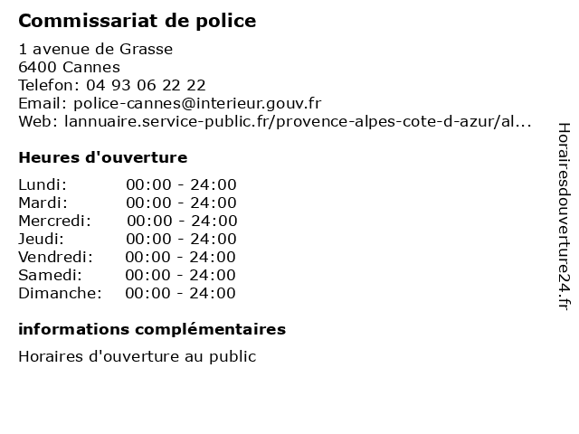 1 Commissariat de police (Distance: 2,11 km) 66 boulevard Sadi-Carnot, 06110 Le Cannet cannet, commissariat, de, le, police 2 Commissariat de police (Distance: 3,46 km) n/a Avenue Jean-Moulin, 06220 Vallauris commissariat, de, police, vallauris 3 Commissariat de police (Distance: 8,80 km) 5 Rue des Frères-Olivier, 06600 Antibes commissaire, commissariat, de, justice, police, sécurité 4 Commissariat de police (Distance: 13,08 km) 1 avenue du Maréchal de Lattre de Tassigny, 06130 Grasse commissaire, commissariat, de, justice, police, sécurité 5 Commissariat de police (Distance: 15,65 km) 20 bis chemin des Grands-Plans, 06800 Cagnes-sur-Mer commissaire, commissariat, de, justice, police, sécurité 6 Commissariat de police (Distance: 19,23 km) n/a Traverse Digue des Français, 06200 Nice commissaire, commissariat, de, justice, police, sécurité |